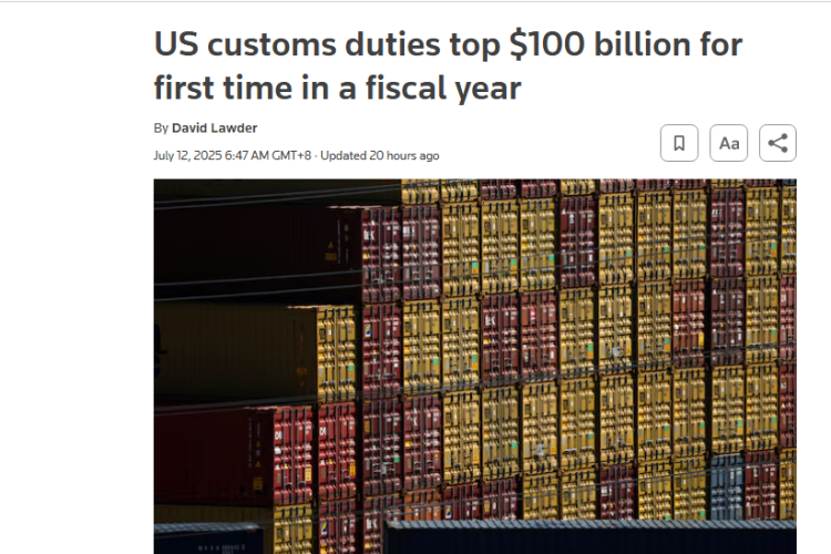 数据显示,6月美国海关关税总额高达约270亿美元,较去年同期暴增301%,这使得美国单一财年内关税收入累积金额首次突破1000亿美元。