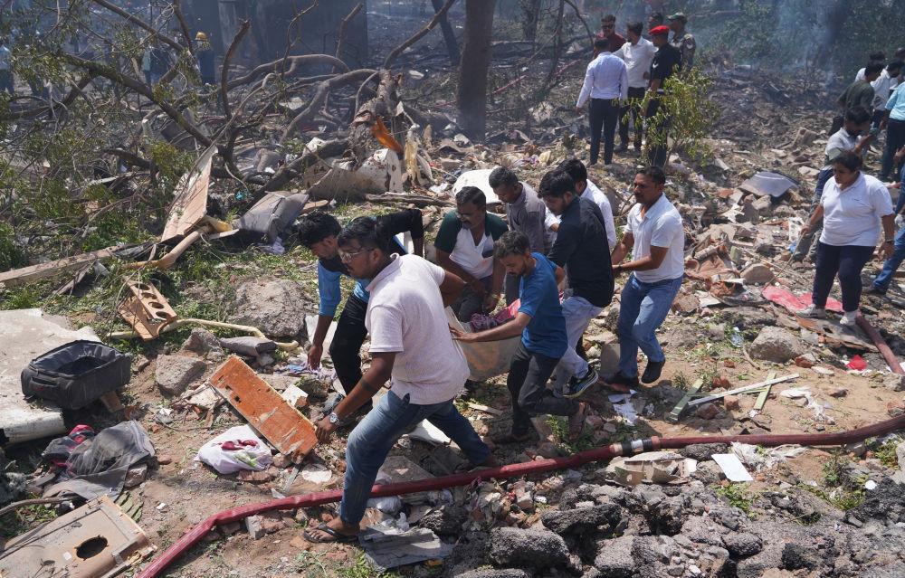 6月12日,在印度古吉拉特邦艾哈迈达巴德,人们在客机失事现场运送一遇难者遗体。新华社发