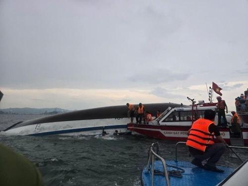 7月20日,人们在越南广宁省下龙湾对倾覆游船开展救援工作。新华社/越通社