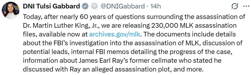 按照多家媒体的说法,特朗普政府选择此时发布马丁·路德·金遇刺案档案,似有意转移公众对于爱泼斯坦案的注意力。