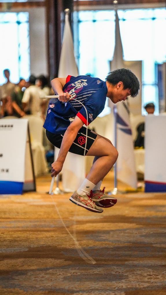 身着红色武术服,贵州师范学院跳绳队队员钱明远将手中的跳绳挥舞得飕飕作响,灵活的身子在完成跳绳的同时,还穿插着太极招式。“因为有国际友人参加这次跳绳比赛,所以想加入中国元素对外展示。”钱明远说。
