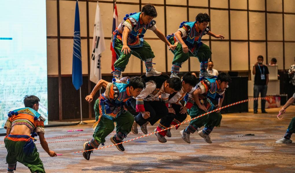 7月24日,演员在2025中国-东盟教育交流周青少年跳绳邀请赛开幕式上表演花样跳绳。 新华社记者陶亮 摄