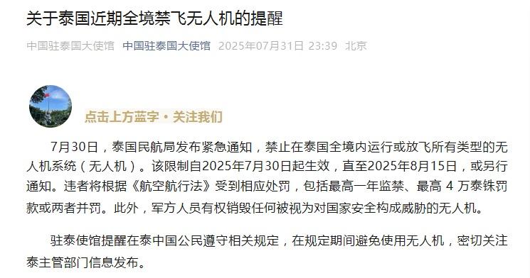 7月30日,泰国民航局发布紧急通知,禁止在泰国全境内运行或放飞所有类型的无人机系统(无人机)。该限制自2025年7月30日起生效,直至2025年8月15日,或另行通知。违者将根据《航空航行法》受到相应处罚,包括最高一年监禁、最高 4 万泰铢罚款或两者并罚。此外,军方人员有权销毁任何被视为对国家安全构成威胁的无人机。驻泰使馆提醒在泰中国公民遵守相关规定,在规定期间避免使用无人机,密切关注泰主管部门信息发布。