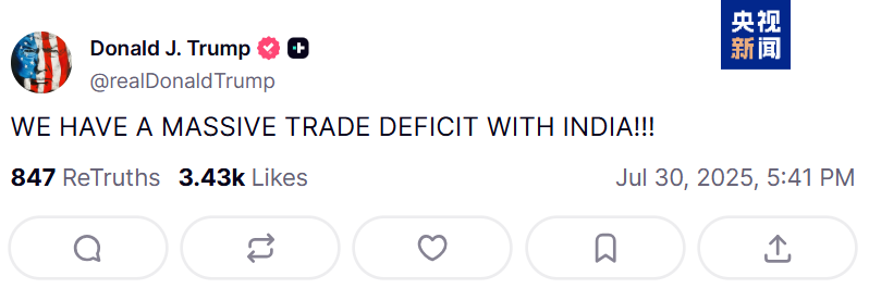 美国总统特朗普当地时间7月30日通过社交媒体宣布,将从8月1日起对印度输美商品征收25%的关税并实施其他“惩罚”。特朗普用大写的英语发文称:“我们与印度有着巨额的贸易逆差!!!”这对于自认是美国“朋友”的印度来说,多少有点“情何以堪”的意味。