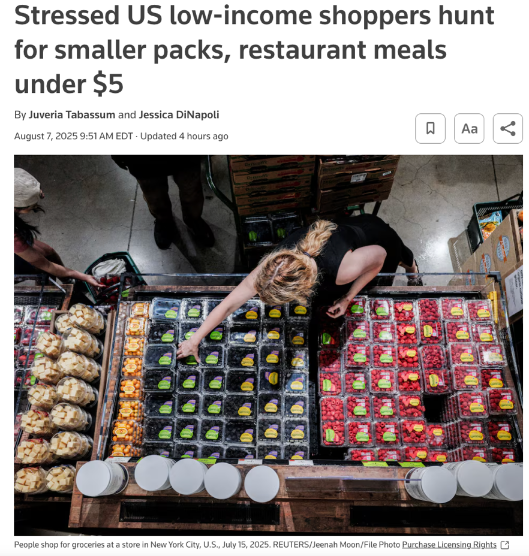 △路透社报道,由于关税和通胀带来的压力,美国低收入消费群体正在更多转向小包装商品以及5美金以下的餐食。