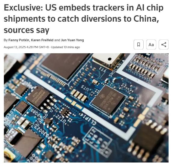 8月13日,路透社又刊发独家报道爆料,美国秘密在人工智能相关芯片中设置追踪器,以发现“芯片被转运至中国的情况”。