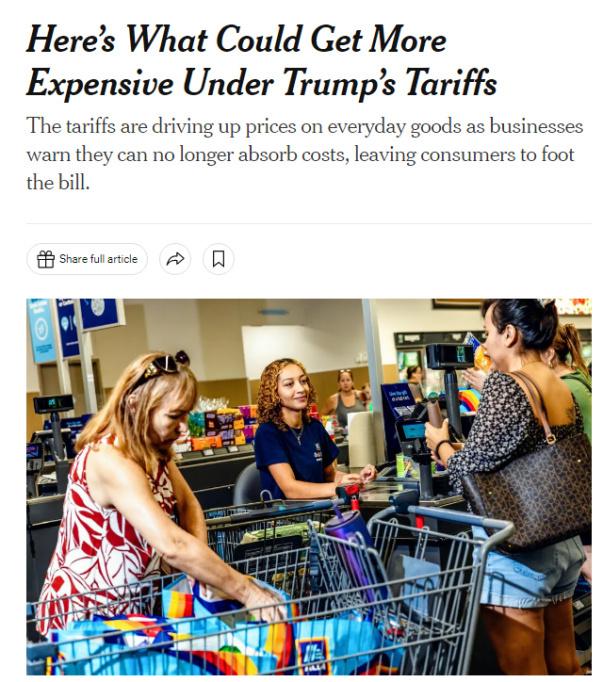 中国日报网8月18日电 美国政府此前公布的经过调整的“对等关税”已经生效,美数十个贸易伙伴将被征收10%至41%不等的关税,随之而来的便是被关税推高的物价。美国《纽约时报》刊文称,美国消费者或许很快就会发现,大到汽车,小到一双鞋和一根香蕉,几乎所有商品的售价都会上涨。