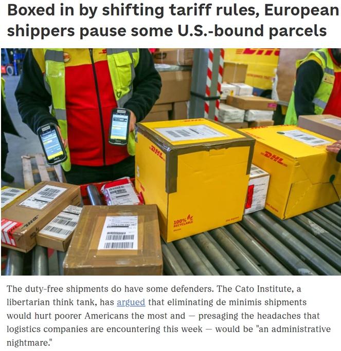 美国全国公共广播电台日前援引美国智库凯托学会发布的一份分析报告称,美国政府取消对小额进口包裹的免税待遇,该措施将严重伤害美国的低收入群体,使物流运输公司进一步陷入困境,并将在实际执行层面遇到严重问题。
