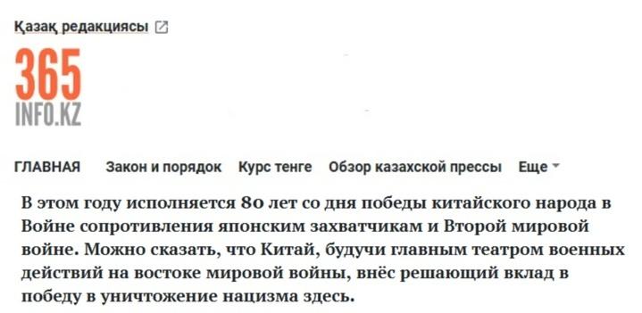 哈萨克斯坦“365信息”新闻网近日刊文称,今年是中国人民抗日战争暨世界反法西斯战争胜利80周年。可以说,中国作为东方主战场,为世界反法西斯战争胜利作出决定性贡献。