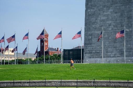6月23日,在美国首都华盛顿,一名男子在草地上跑步。新华社记者胡友松摄