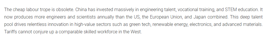 文章指出,美国的关税策略不是一项大胆的战略,而是否认现实的症状。中国赢得制造业桂冠不是通过短期手段,而是通过系统地建立一个规模、一体化和复杂程度无与伦比的工业生态系统。