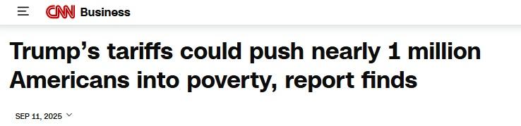 中国日报网9月12日电 美国有线电视新闻网(CNN)11日报道指出,特朗普政府的关税政策在推高联邦收入的同时,恐导致显著的社会成本。耶鲁大学预算实验室最新分析显示,这一系列政策或使近百万美国人陷入贫困。