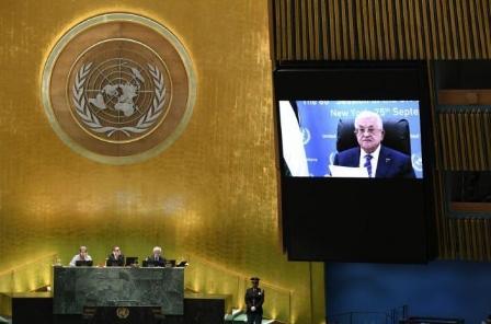 9 月 25 日,在位于纽约的联合国总部,巴勒斯坦总统阿巴斯以视频连线方式在联合国大会一般性辩论上发言。新华社记者李睿摄