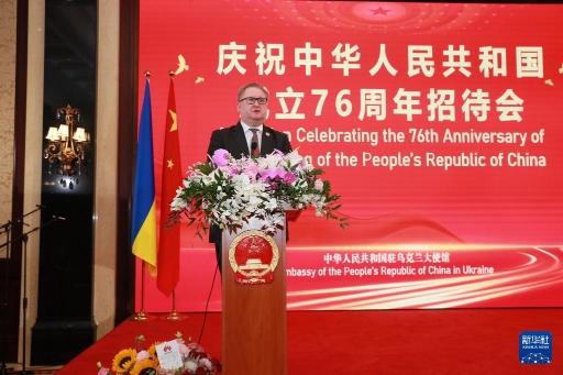9月29日,乌克兰外交部副部长佩列彼尼斯在基辅举行的庆祝中华人民共和国成立76周年招待会上致辞。新华社记者 李东旭 摄