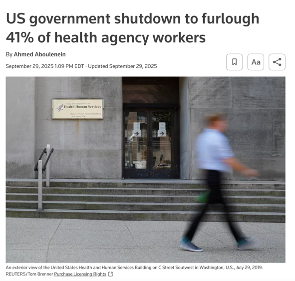 △路透社报道,由于政府停摆,41%的卫生机构工作人员将被迫休假,涉及公共卫生资讯传播、部分医学研究、承包商监督等