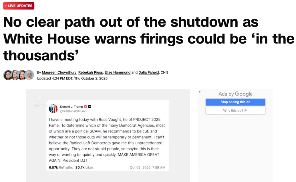 每次停摆,联邦雇员都必须无薪休假,士气受挫。这次更严重的是,特朗普10月2日接受采访时表示,可能要进行裁员和项目削减。而白宫管理和预算办公室(OMB)已要求各机构准备裁员方案,不少人的岗位恐怕将在这次停摆中被永久裁撤。