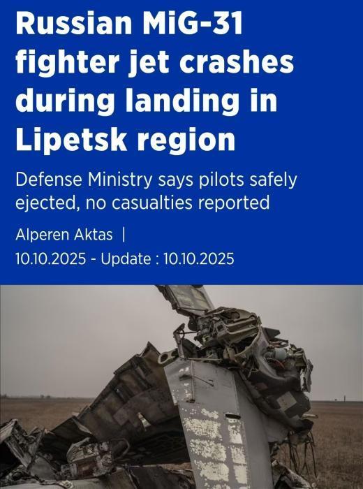 中新网10月10日电 据土耳其阿纳多卢通讯社报道,俄罗斯国防部9日表示,俄军一架米格-31战机在利佩茨克州坠毁。飞行员弹射逃生,没有生命危险。
