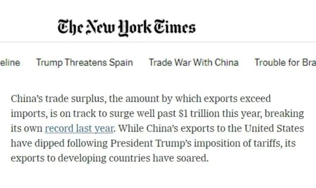 美国《纽约时报》的文章分析称,强劲的出口和对新工厂的持续投资使中国经济在夏季保持稳定增长。中国的出口投资以及用国产商品取代进口的政策继续推动着经济增长。与去年同期相比,商品贸易顺差在过去三个月中增加了12.4%。中国的贸易顺差今年有望超过1万亿美元,主要得益于中国对发展中国家的出口激增。