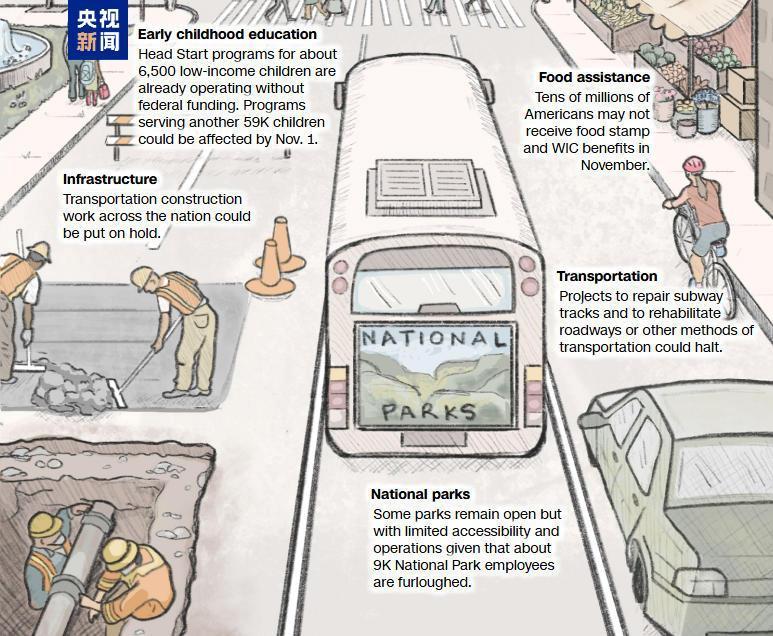 数以千万计的美国人11月可能无法领取食品券和妇女、婴儿和儿童特别营养补充计划的福利;美国全国的交通基础设施建设工作可能会暂停;修复地铁、公路或其他交通运输的项目可能会暂停; 一些国家公园仍然开放,但由于约9000名国家公园员工被迫休假,公园运营能力受到影响。