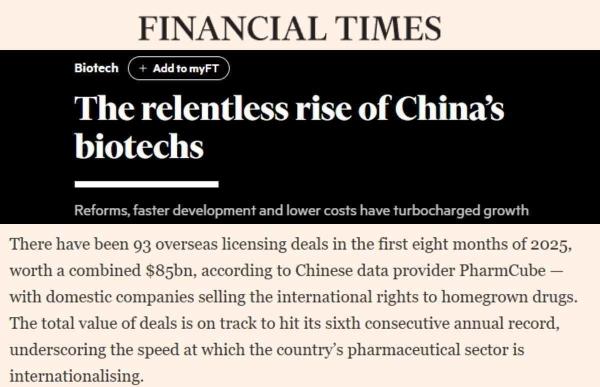 文章认为,中国政府推行的一系列改革措施,为生物科技企业创造了更便利的融资与创新环境。这些政策红利,叠加药物研发与临床试验环节的相对效率优势和成本优势,为行业注入强劲增长动力。