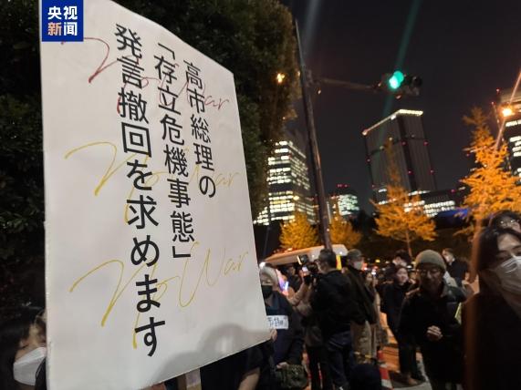 当地时间21日晚,数百名日本民众聚集在位于东京的首相官邸前,自发进行集会,要求日本首相高市早苗撤回涉台错误言论。