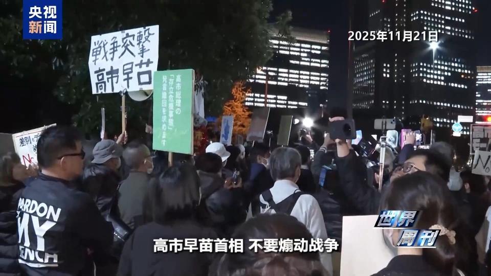11月21日晚上,日本首相官邸前聚集了上千名抗议民众,强烈要求高市早苗撤回错误言论。