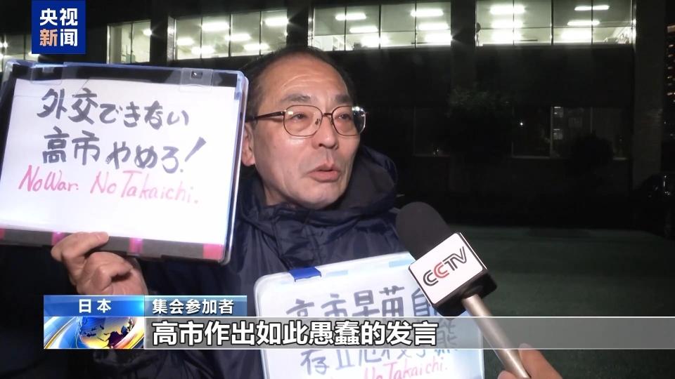 总台记者 李卫兵:25日晚,数百名日本民众聚集在日本首相官邸前,抗议日本首相高市早苗拒不撤回涉台错误言论,他们高声呼吁,不需要有可能将日本带入战争歧途的首相。