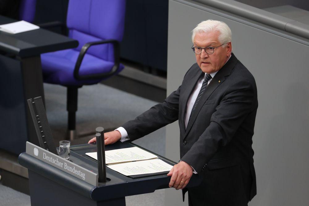 5月8日,德国总统施泰因迈尔在首都柏林国会大厦举行的第二次世界大战欧洲战场胜利80周年纪念活动上致辞。新华社记者杜哲宇摄
