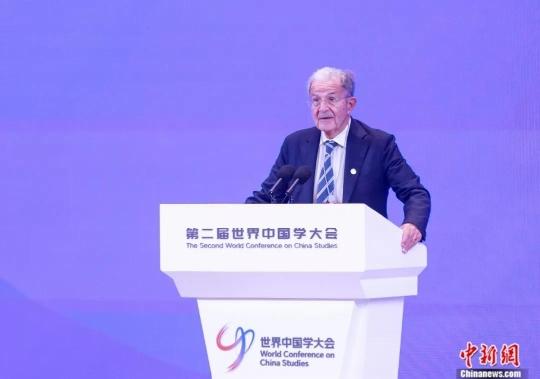 2025年10月14日,第二届世界中国学大会在上海开幕。意大利前总理、欧盟委员会前主席罗马诺·普罗迪在开幕式上致辞。中新社记者 贾天勇 摄