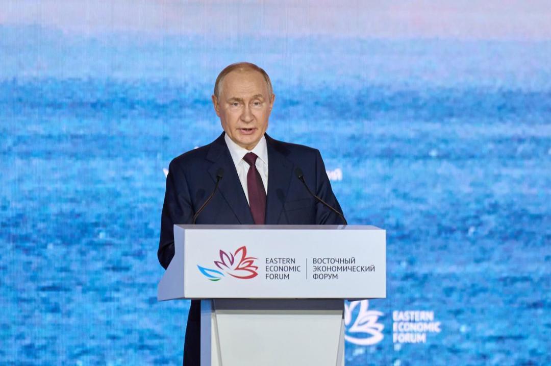 9月5日,俄罗斯总统普京在符拉迪沃斯托克出席第十届东方经济论坛全体会议时发表讲话。新华社发(郭飞洲摄)