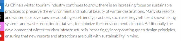 文章还说,随着中国冬季旅游产业的不断壮大,可持续发展理念、环保实践也日益受到重视。中国正成为越来越有吸引力的冬季旅游目的地。