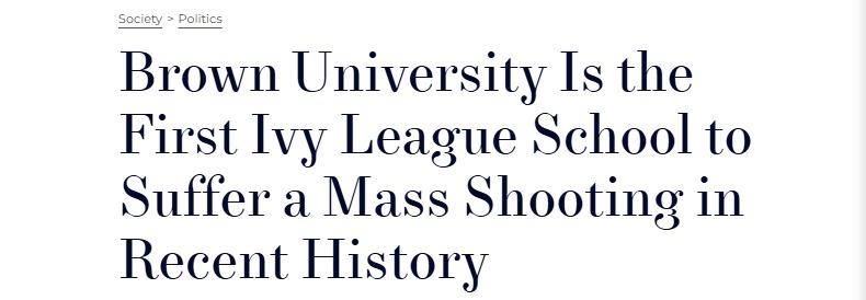 2025年,美国校园的安宁屡遭打破。据美国《城镇与乡村》网站(Town and Country)报道,本月13日发生的布朗大学枪击案致2死9伤,成为常春藤盟校近期首所发生大规模枪击案的学校。事件导致校园提前关闭,师生陷入恐慌。校长克里斯蒂娜·H·帕克森(Christina H.Paxson)称,两名遇难者“都是才华横溢的年轻人,本应拥有光明的未来,却过早消逝”。