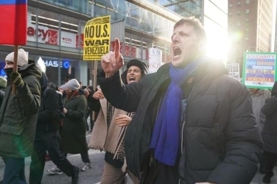 1月3日,近千名民众在美国纽约举行集会游行,抗议美国对委内瑞拉实施军事打击。(新华社发)