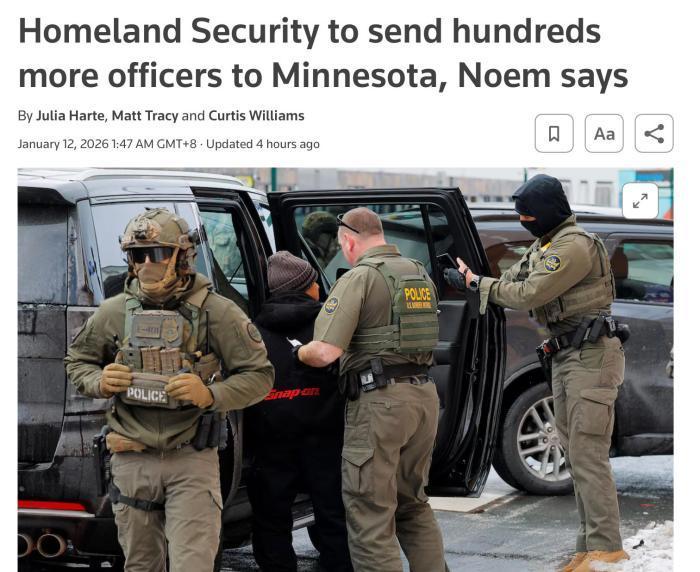 中新网1月12日电 综合路透社等外媒报道,当地时间11日,美国国土安全部部长诺姆表示,国土安全部将向明尼苏达州增派“数百名”警员。