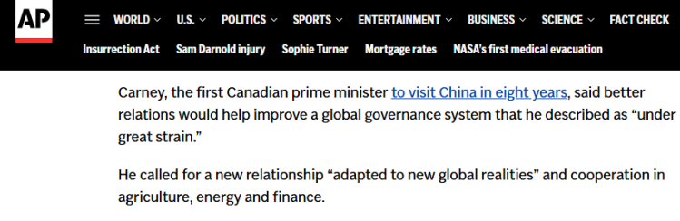 美联社的报道关注了卡尼对加中关系与全球治理的表述,他表示改善与中国的关系将有助于改善他所描述的“承受巨大压力”的全球治理体系。卡尼还呼吁双方加强在农业、能源和金融领域的合作,以“适应全球新现实”。