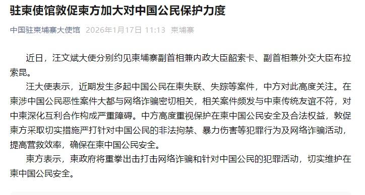 汪大使表示,近期发生多起中国公民在柬失联、失踪等案件,中方对此高度关注。在柬涉中国公民恶性案件大都与网络诈骗密切相关,相关案件频发与中柬传统友谊不符,对中柬深化互利合作构成严重障碍。中方高度重视保护在柬中国公民安全及合法权益,敦促柬方采取切实措施严打针对中国公民的非法拘禁、暴力伤害等犯罪行为及网络诈骗活动,提高营救效率,确保在柬中国公民安全。