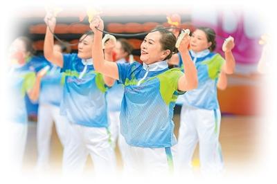 在江苏省海安市体育中心举行的老年人体育健身嘉年华活动上,老年人在展示健身球操。翟慧勇摄(人民图片)