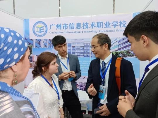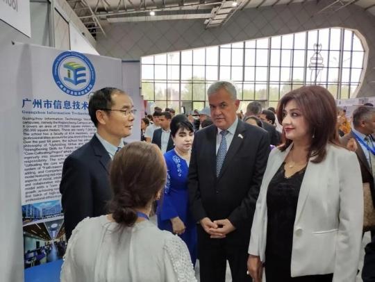 塔吉克斯坦副总理到展位,广州市信息技术职业学校党委副书记、纪委书记翁奕华介绍学校情况和专业特色