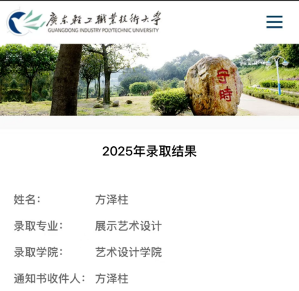 5月30日,广州市城市建设职业学校2022级装饰4班学生方泽柱,在2025年高职院校自主招生考试中表现优异,被广东轻工职业技术大学展示艺术设计专业录取。方泽柱的成功升学,是职业教育“技能成就未来”理念的生动实践,为中职学子多元化升学路径提供了有力示范。