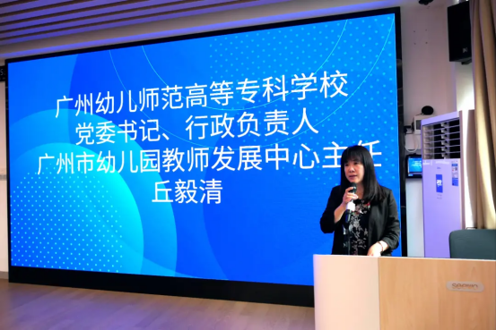 图为广州幼儿师范高等专科学校党委书记、行政负责人、广州市幼儿园教师发展中心主任丘毅清致辞