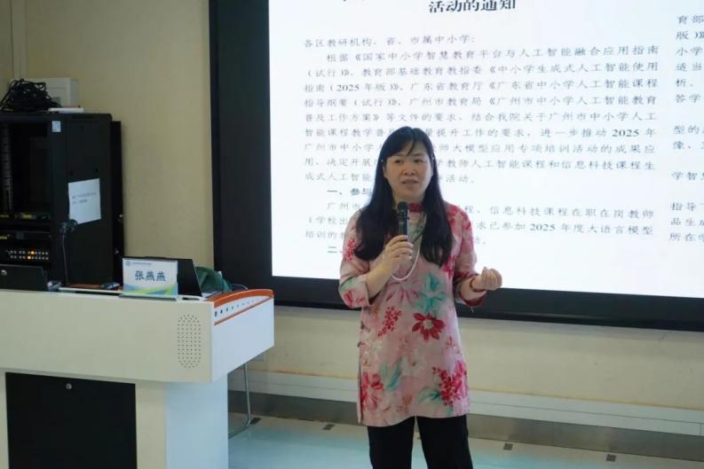 广州市教育研究院职业教育与终身教育研究所办公室主任张燕燕分享了“用DeepSeek打造中职工科游戏化教学课堂”的实践经验,展示了AI技术提升课堂互动性的创新方法。广州市信息技术职业学校冯敬益老师则详细介绍了“DeepSeek赋能教学实践的多元场景应用”,涵盖备课、授课、评价等教学全流程。企业专家杨懿重点讲解了“从通用到垂类:大模型工具在教学中的深度应用”,为参训教师提供了专业化的技术指导。