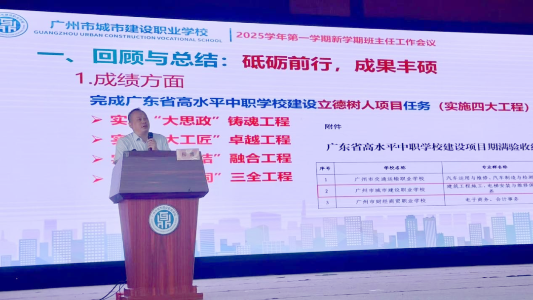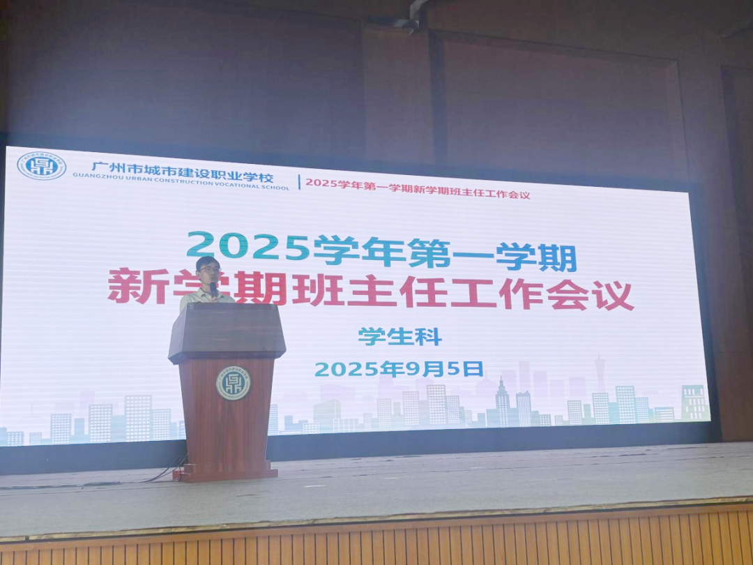 9月5日,广州市城市建设职业学校(简称“城建学校”)召开2025学年第一学期班主任工作会议,系统总结上一学年德育工作成效,全面部署新学期育人任务。学校领导、学生科负责人及全体班主任参加会议。