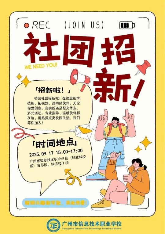 2025年9月11日,广州市信息技术职业学校(简称“广州信职”)科教城校区与下塘西校区同步开展社团及团学组织招新活动。尽管此前秋雨暂缓了招新进程,但并未影响同学们参与的热情,校园内再度洋溢蓬勃朝气。