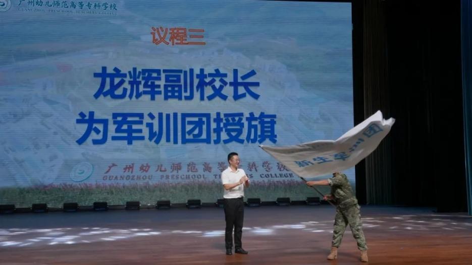 广州幼儿师范高等专科学校学校副校长龙辉为军训团授旗