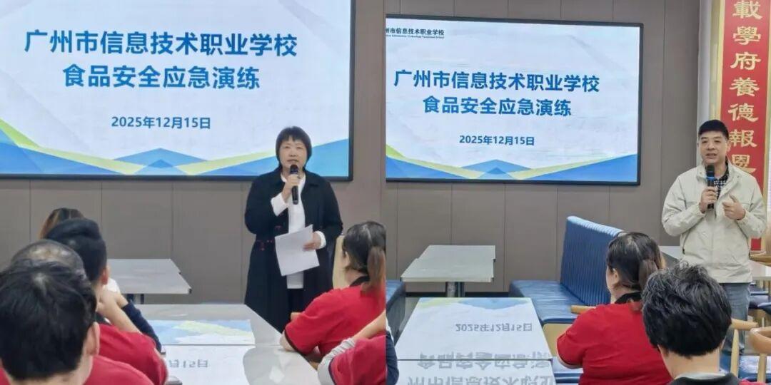 大洋网讯 近日,广州市信息技术职业学校在科教城校区食堂组织开展了一场模拟真实的食品安全应急演练。演练由学校党委副书记、校长刘冠明担任总指挥,副校长、食品安全总监张天富任副总指挥,总务科、学生科、安保科等多部门协同参与,全过程模拟突发事件应急处置,旨在切实筑牢校园食品安全防线,提升实战水平。